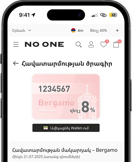 - Հավատարմության քարտը գործում է noone.am կայքում և NO ONE խանութ-սրահներում: